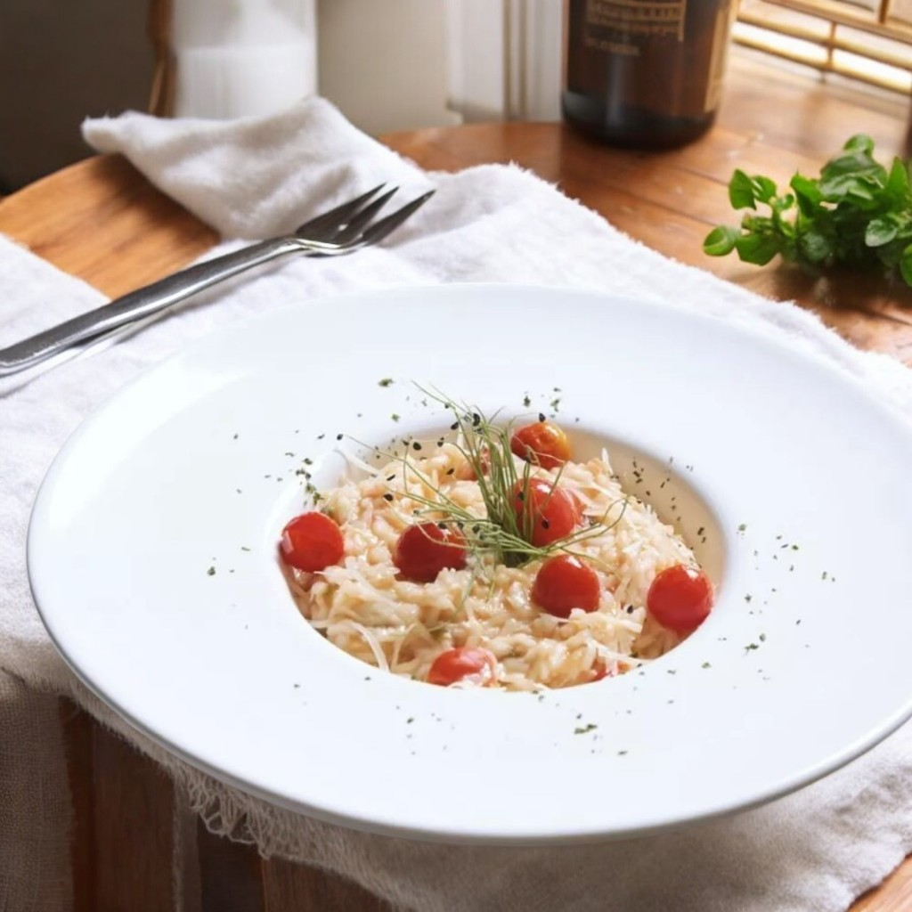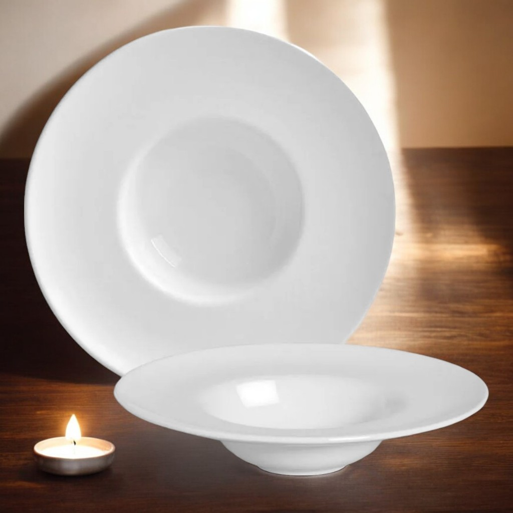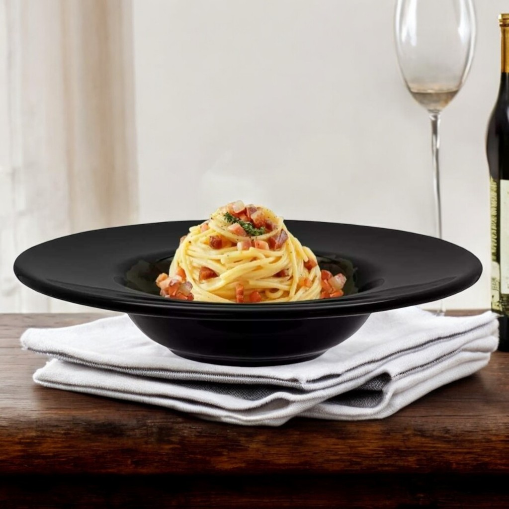 Diferente do prato fundo tradicional, o modelo chapéu invertido possui borda larga e fundo bem delimitado, criando o encaixe perfeito para massas, risotos, saladas e sobremesas.
