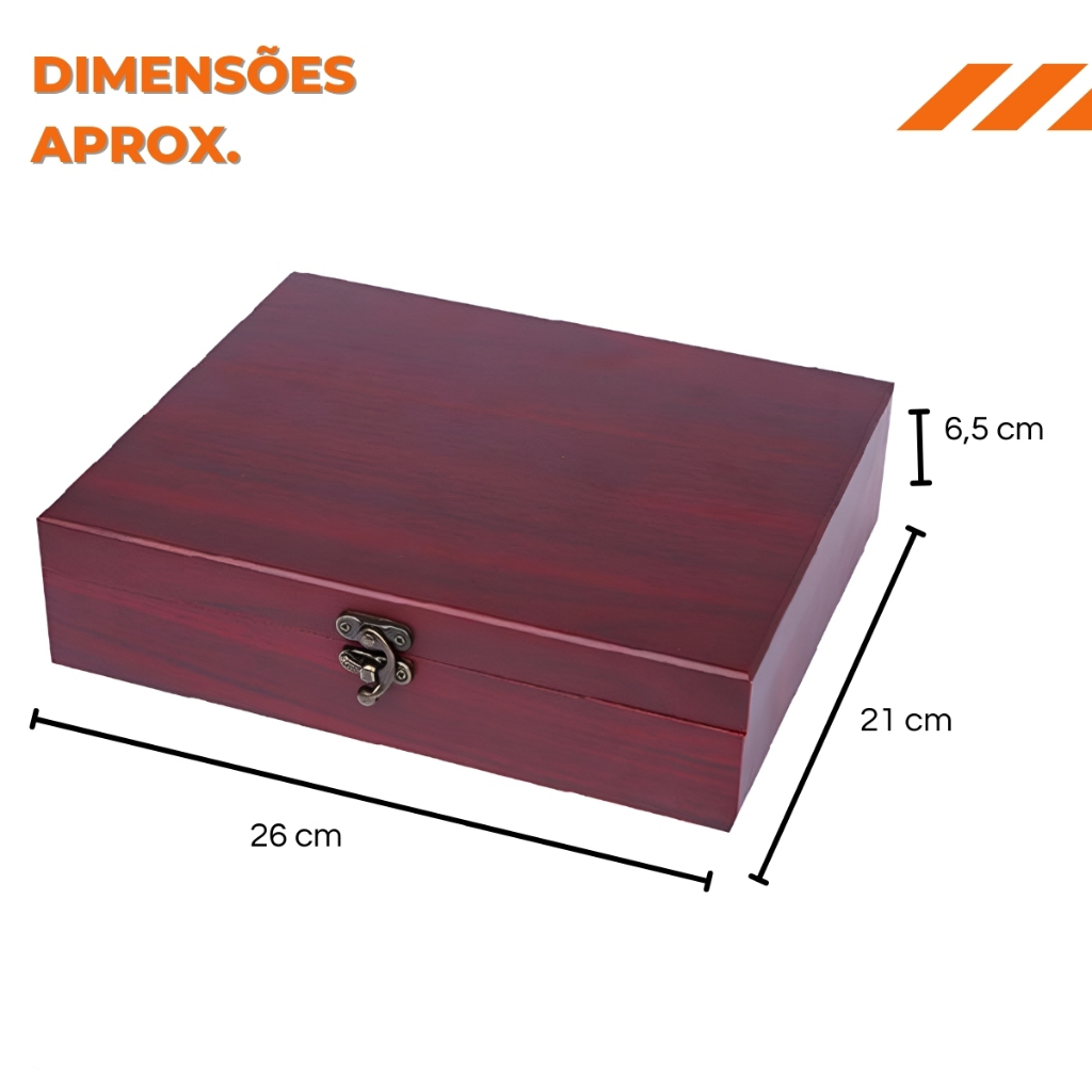 Com este kit, você tem todas as ferramentas essenciais sempre organizadas e protegidas em uma elegante maleta de madeira com espuma interna, que mantém cada peça no lugar certo.