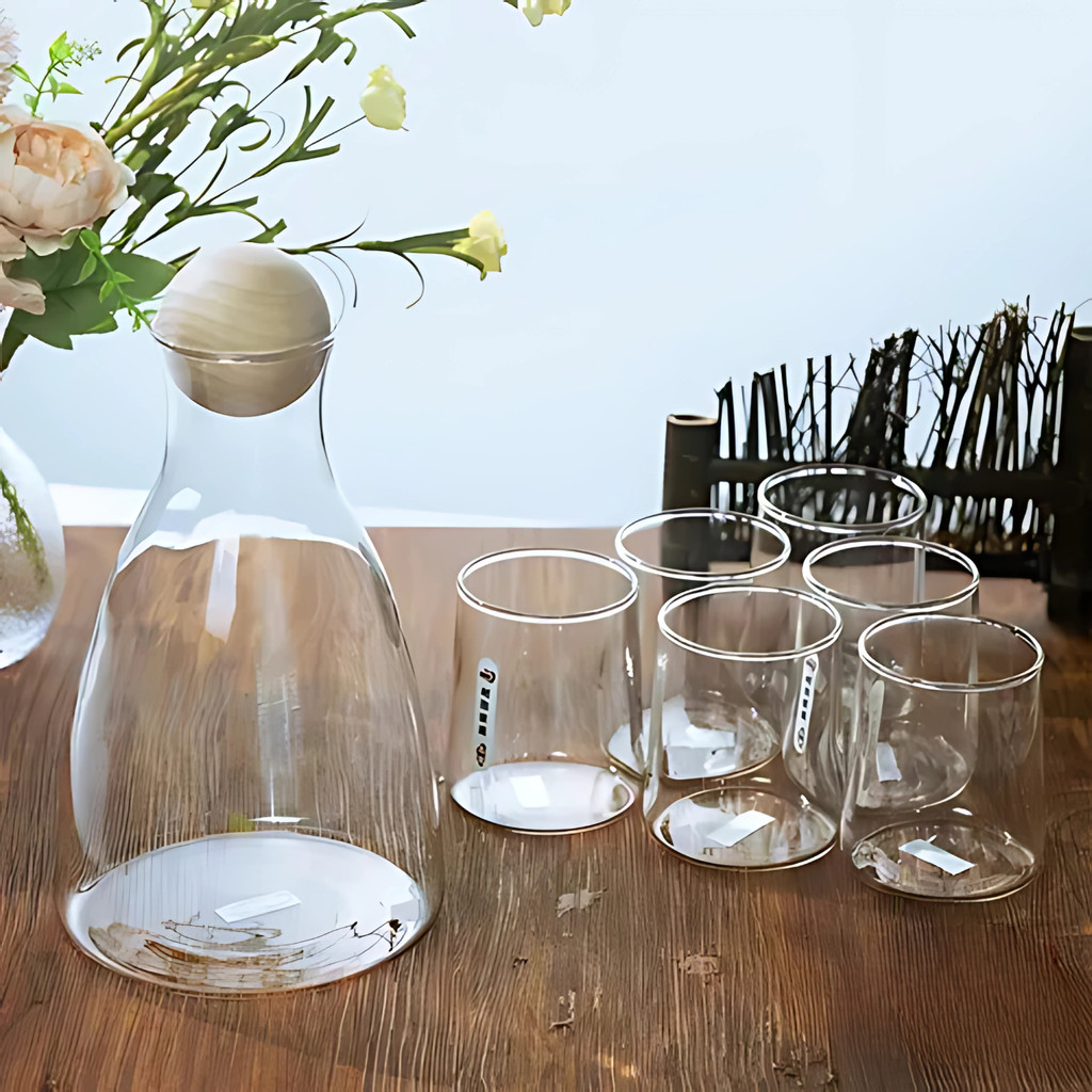Transforme qualquer refeição ou encontro em um momento especial com o Conjunto de Jarra de Vidro com Tampa de Bambu + 6 Copos.