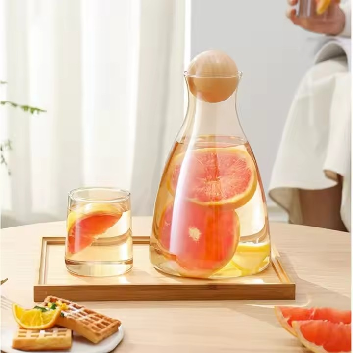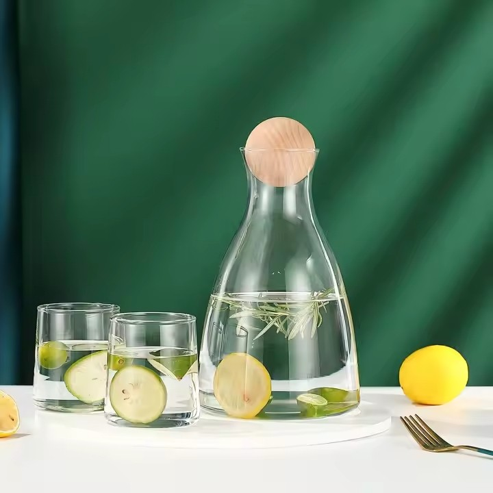 A jarra com tampa de bambu traz um visual moderno e acolhedor, enquanto os copos de vidro com base facetada elevam a apresentação das bebidas.