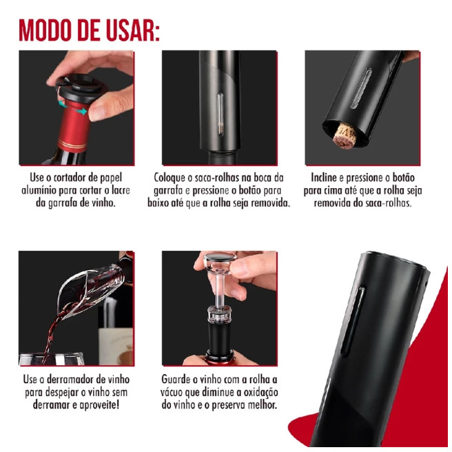 O motor elétrico removendo a rolha em segundos, o cortador de lacre garantindo um acabamento impecável, o dosador evitando desperdícios e a tampa a vácuo preservando o sabor — cada peça desse kit foi criada para elevar a experiência do vinho.