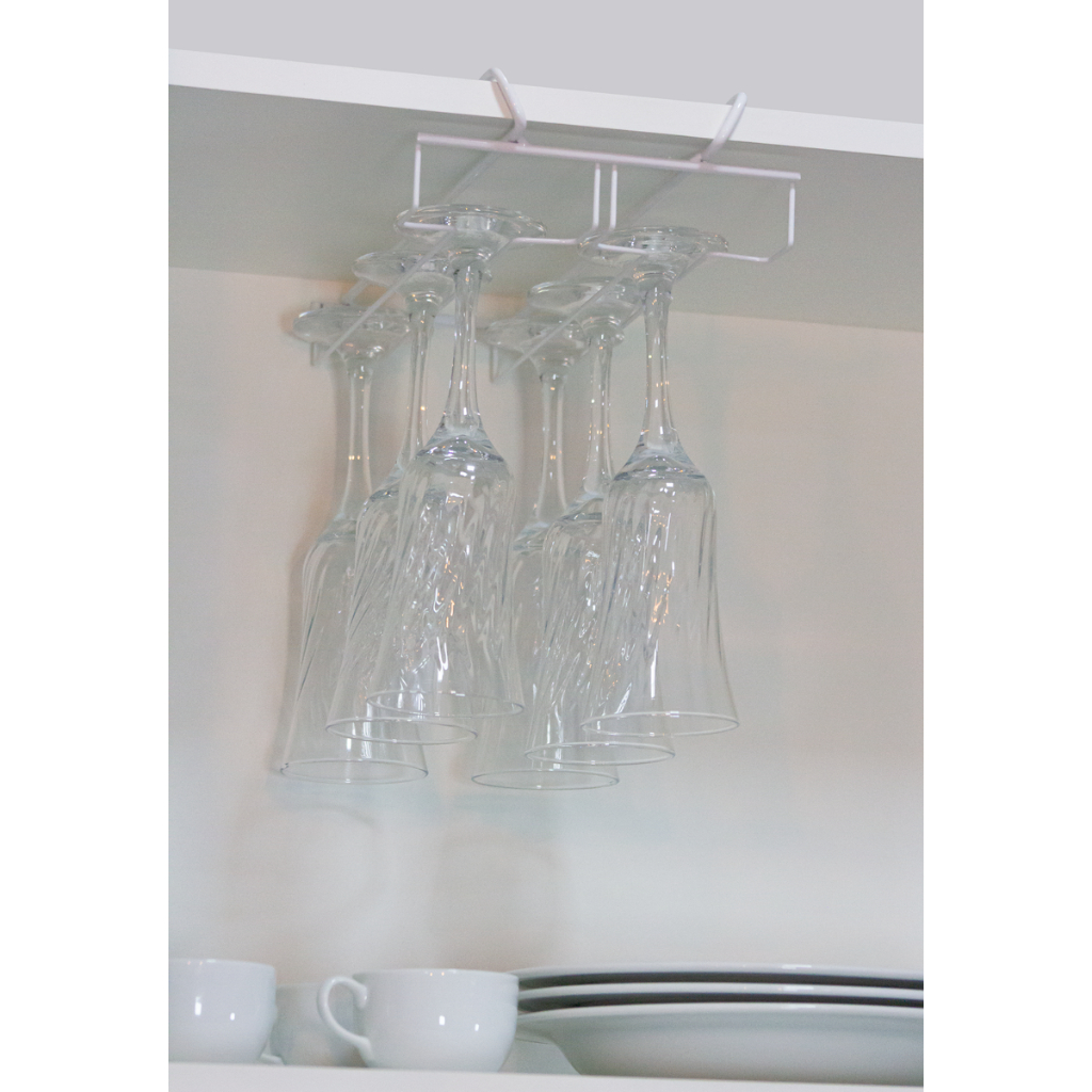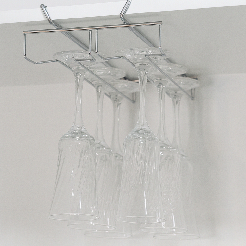As taças ficam suspensas pela base, garantindo secagem adequada, evitando poeira interna e deixando o ambiente com um charme profissional digno de restaurante.